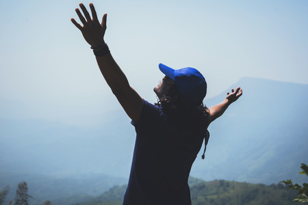 Man praying on the mountains raised hands Travel Lifestyle spiritual relaxation emotional concept, Freedom and travel adventure.