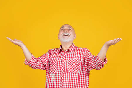 An aged happy man standing on top of a mountain with his arms outstretched. Beautiful view of the mountains and sky from the back of a man. The concept of freedom and happiness