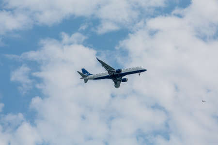 Washington DC, USA 10/02/2020: Isolated Bug eye view of an Embraer ERJ 145 airplane by United Express. Image was captured right after take off from DCA Reagan Airport. It is retracting landing gears.