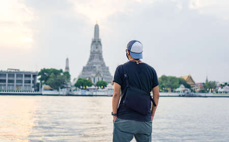 Asian male tourists stand by the Chao Phraya River, admiring the beauty of Wat Arun at sunset, Buddhist temple landmarks in Bangkok, Thailand.