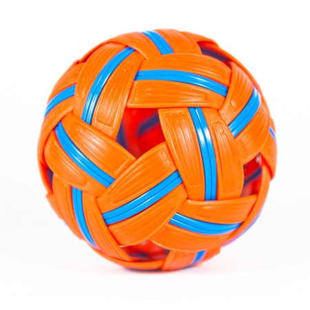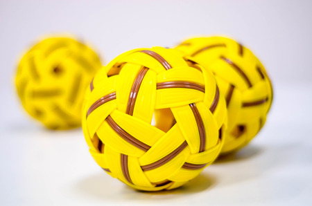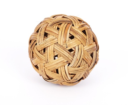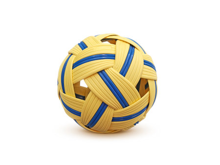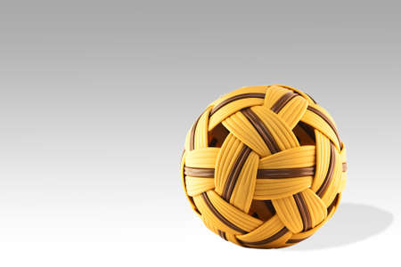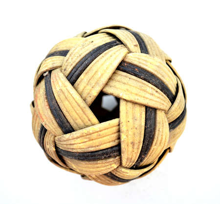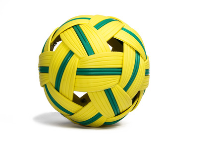 A levitation picture of takraw ball on isolated white background. Takraw is a sport using rattan ball and only allowing players to use their feet, knee, chest and head to touch the ball.