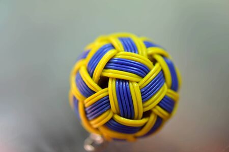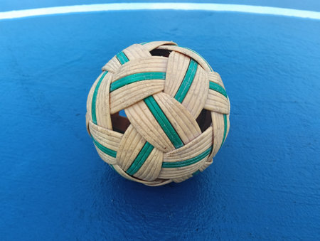 synthetic sepaktakraw or takraw or buka ball, kick volleyball or foot volleyballball on blue background court , closeup of photo taken in malaysia.