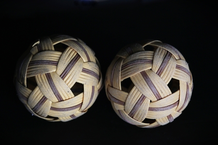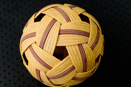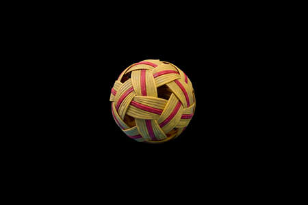 synthetic rattan sepaktakraw or takraw or buka ball, kick volleyball or foot volleyballball on black background , closeup of photo taken in malaysia.