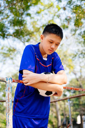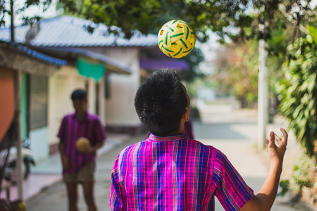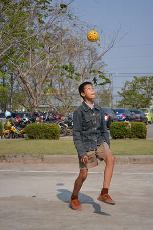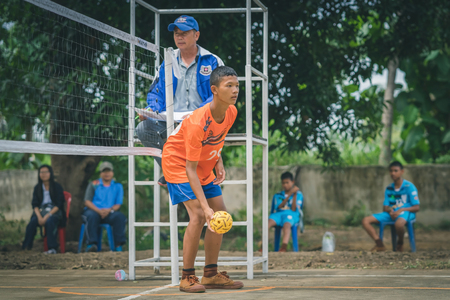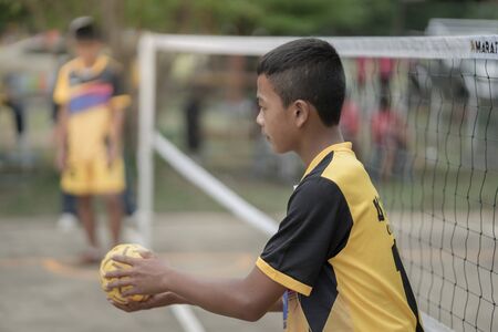 Students take exams Sepak Takraw to use head to touch the ball in Kanchanaburi Thailand.