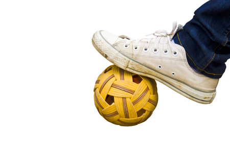 Selective focus of takraw been hold by a men on isolated white background. Sepak takraw or kick volleyball is a sport native to Southeast Asia.
