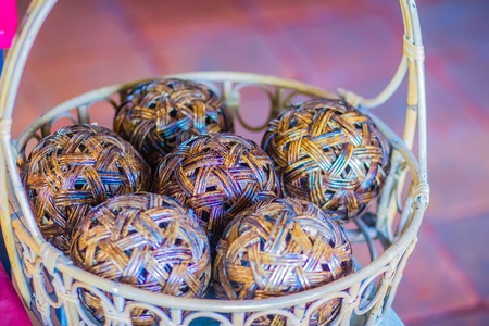 Rattan balls in the basket for sale in the market.Handmade lacquered rattan ball for event decoration.