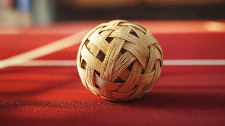 Woven Sepak Takraw ball lying on a red sports court, with a blurred background for depth.