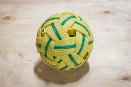 Green and yellow rattan ball on wooden floor. Selective focus.