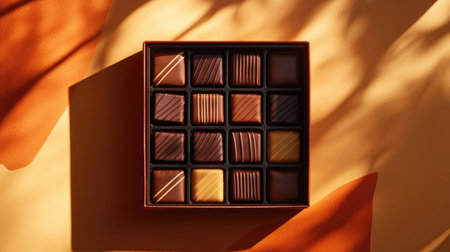 A beautifully arranged box of assorted chocolates featuring a mix of dark and milk varieties, set against a warm-toned background. The image captures the richness and elegance of a gourmet treat, perfect for gifting or personal indulgence.