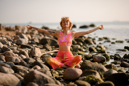 Mature woman at holiday destination beach contemplating lake sitting on shore in yoga position holding hands at sides, meditating meditating outdoors. Good happens mature sport and healthy lifestyle