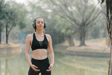 Sport woman under big tree breathing deeply fresh air with arms raised outdoor in urban park.