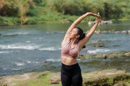 A slender, tanned Asian girl in sportswear performs yoga poses outdoors in a beautiful riverside setting in the morning. The theme is meditation on health, mental, and physical well-being.