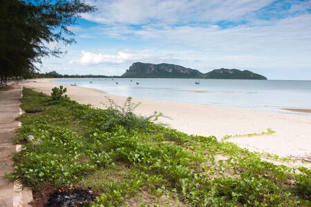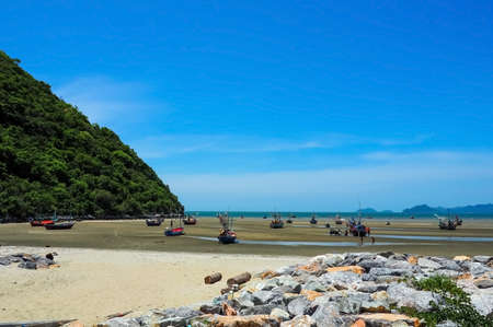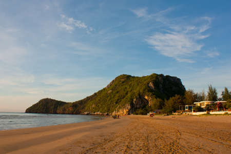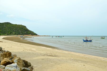Thailand summer beach at Khaosamroiyod Prachubkeereekhan Thailand. summer holiday idea to travel . Backpacker life. peacefulness mind of blue. scenatic of sea nd mountain wiyh fisherman boat waiting at shore.sunset tone