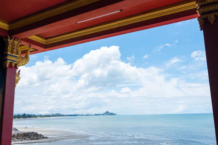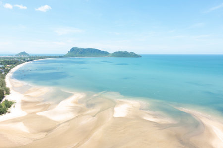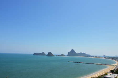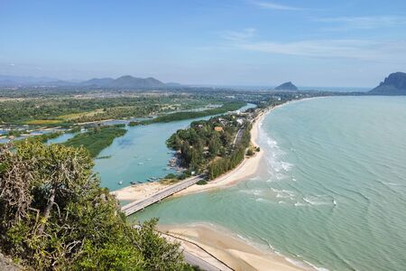 Aerial view landscape of Prajuap Gulf with blue sky viewed from Khao Chong Krajok temple top view point, Prachuap Khiri Khan Province, Thailand