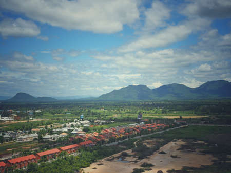 Beautiful high angle panorama view separate sea and sea sky background from the mountain at Khao Lom Muak, Hua-Hin District, Thailand