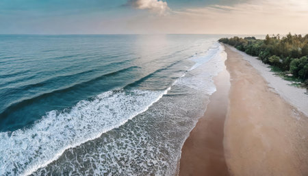 Experience the serene charm of this mesmerizing drone photograph capturing a picturesque beach scene with vibrant turquoise waters, gentle waves, and warm sunlight, perfectly highlighting