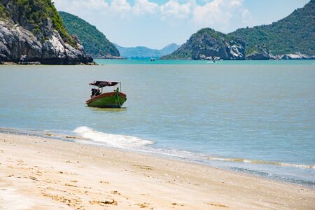 Tropical beach with local boat at island in Thailand. Sea beach view background