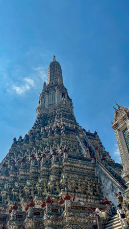 A low angle view of Wat Arun temple with a beautiful blue sky background