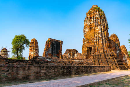 Ruins of ancient city and temples Ayutthaya, Thailand. Old kingdom of Siam. Summer day with blue sky. Famous tourist destination, spiritual place near Bangkok.