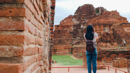 Traveler Asian woman using camera for take a picture while spending holiday trip at Ayutthaya, Thailand, Japanese female tourist enjoy her journey at amazing landmark in traditional city.