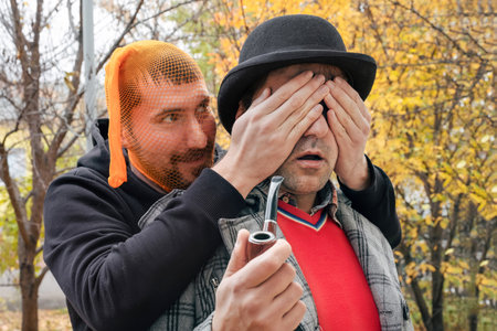 A robber with a stocking on his head tries to rob a man by covering his eyes with his hands. Robbery in a humorous style. Conceptual image.