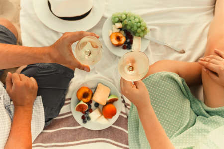 Top view of anonymous man and woman with wineglasses proposing toast over fruits during romantic picnic at the beach