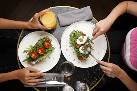 Friends group having english breakfast at cafe restaurant, close-up.