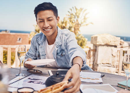Man eating food in lunch meeting at restaurant, worker planning career growth at coffee shop and hungry while working with meal at cafe. Happy person with smile at employee business workshop