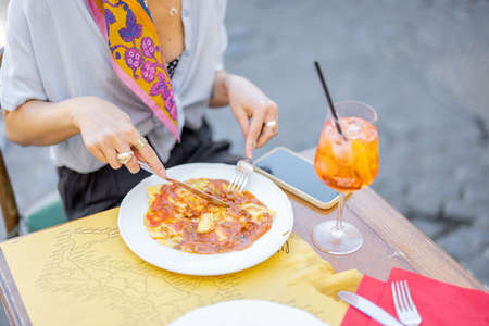 Woman eating ravioli with bolognese sause and drinking Spritz Aperol at restaurant outdoors, close-up view. Concept of italian gastronomy