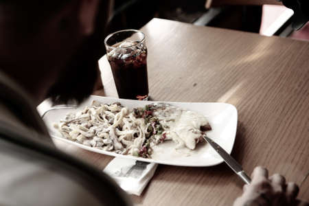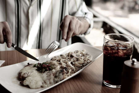 Macro picture of a tasty dish in a blue plate on a white table background. Hand are cutting a piece of juicy meat. Copy space.