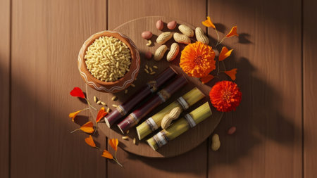 Puffed rice, sugarcane, peanuts, marigolds on wood.