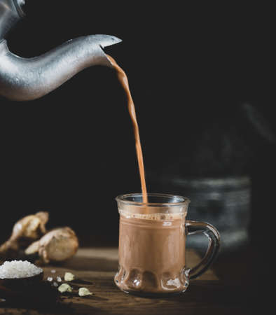 Hands Pouring Tea into the glass cup - Concept of masala ingredients required for making tea with vintage look