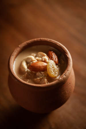 Close up of a famous Bengali dessert Nolen Gurer Chanar Payesh or Milk pudding of cottage cheese in an earthen pot called Kullahad. Top-down view, wooden background.