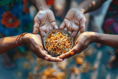 Outstretched hands offering a plate of colorful mixed rice in a communal or charity feeding setting, emphasizing sharing and caring