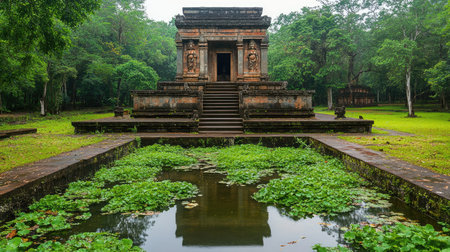 This serene image captures an ancient temple set in lush greenery, surrounded by water and nature, highlighting its architectural beauty and tranquil atmosphere.