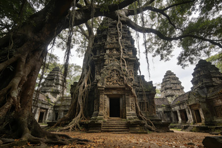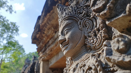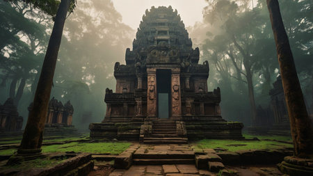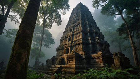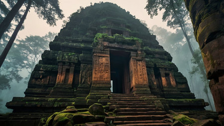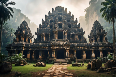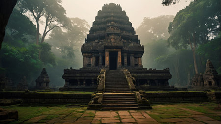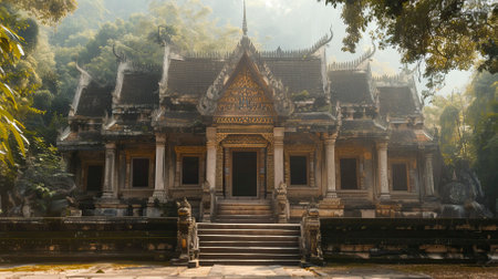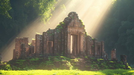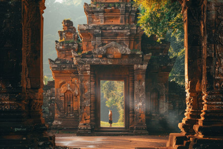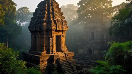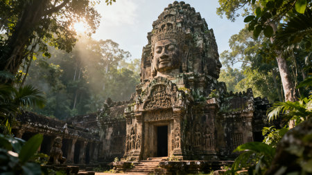 An Ancient historical landmark with intricate stone carvings surrounded by lush greenery and soft sunlight filtering through