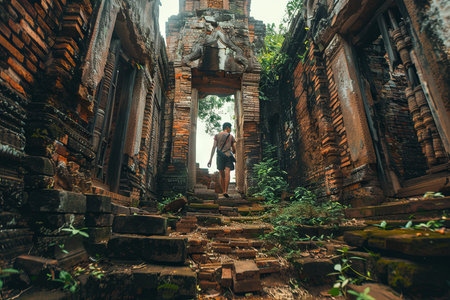 Man with backpack standing at the entrance to the ancient temple in Laos