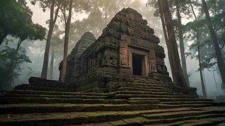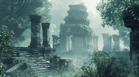Illustration of ancient ruins surrounded by mist and foliage, capturing the serene and mystical atmosphere of a forgotten civilization