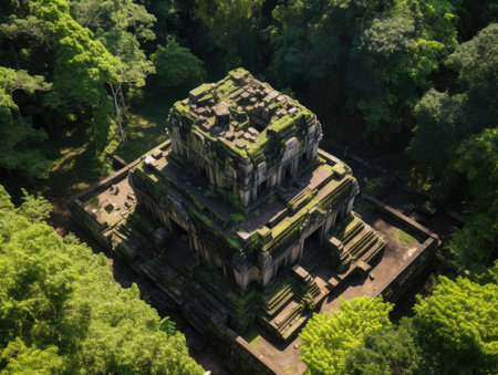 Ruins of an old Temple in the middle of tropical rainforest high altitude aerial view - Generative AI