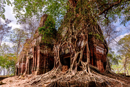 Tree roots wrapped around a tower of Prasat Pram Temple ruins at Koh Ker, Siem Reap, Cambodia