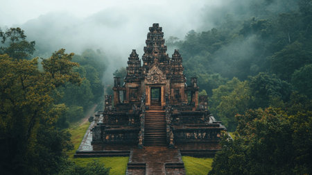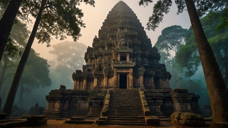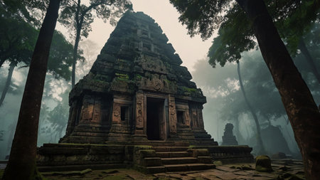 Mysterious temple in the morning mist.