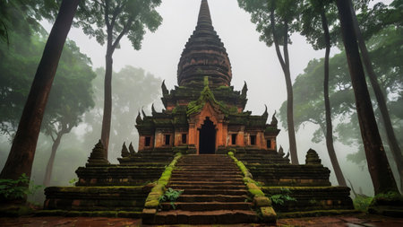 Ancient temple in the forest with fog in the morning at Chiang Mai, Thailand