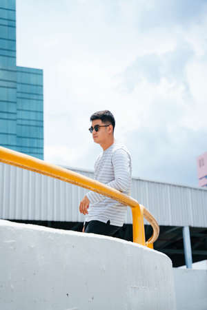 Portrait of happy handsome smiling young Asian man , posing outdoor.