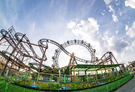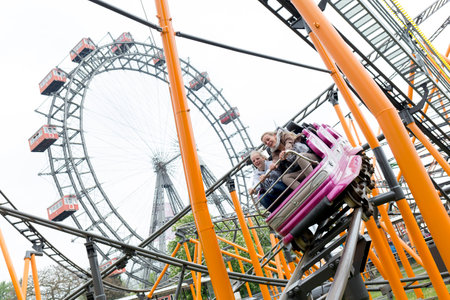 Vienna, Austria - May 2, 2015: Tourists are riding a roller coaster near the large ferris wheel in Prater, Vienna.