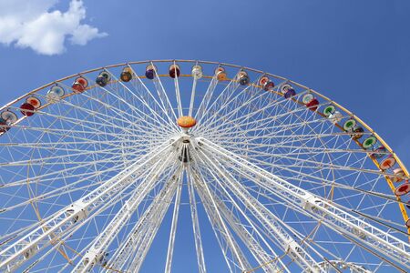 Ferris wheel on blue sky background. In the amusement Park. The weekend