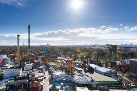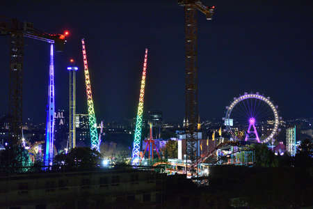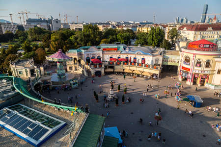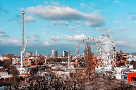 Vienna, Austria - August 28, 2022: A panoramic view of the famous Wurstelprater amusement park, also known as simply Prater, that opened in 1766 in Vienna, Austria