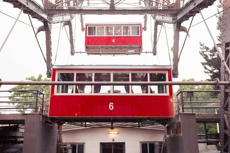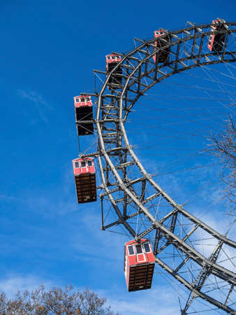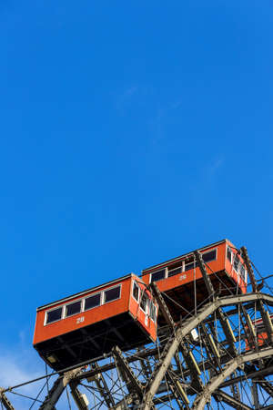 View of famous historic red and the oldest ferris wheel of Europe, cabin up in the air on Prater Park.