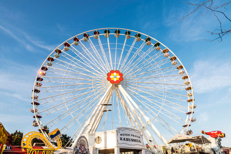 Vienna, Austria - October 16, 2022: Blumenrad, ferris wheel in the Wurstelprater or Prater, amusement park in Leopoldstadt, Vienna, Austria.
