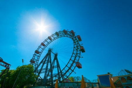 Giant Ferris Wheel against bright sun in Prater Park in Vienna, Austria