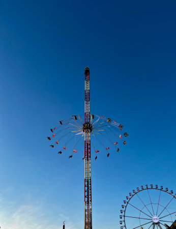 A vibrant amusement park ride towers against a clear blue sky, creating a sense of adventure and excitement. Perfect for capturing the essence of fun and leisure.